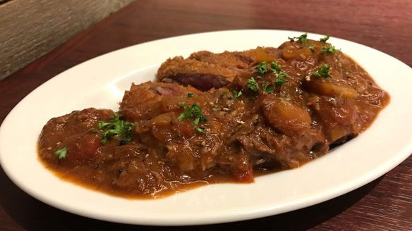 希少部位『ザブトン』の牛カツに、数種類の香味野菜とスパイスをじっくり煮込んだデミグラスソースで仕上げた一皿は、常連様からも大変ご好評頂いております。
